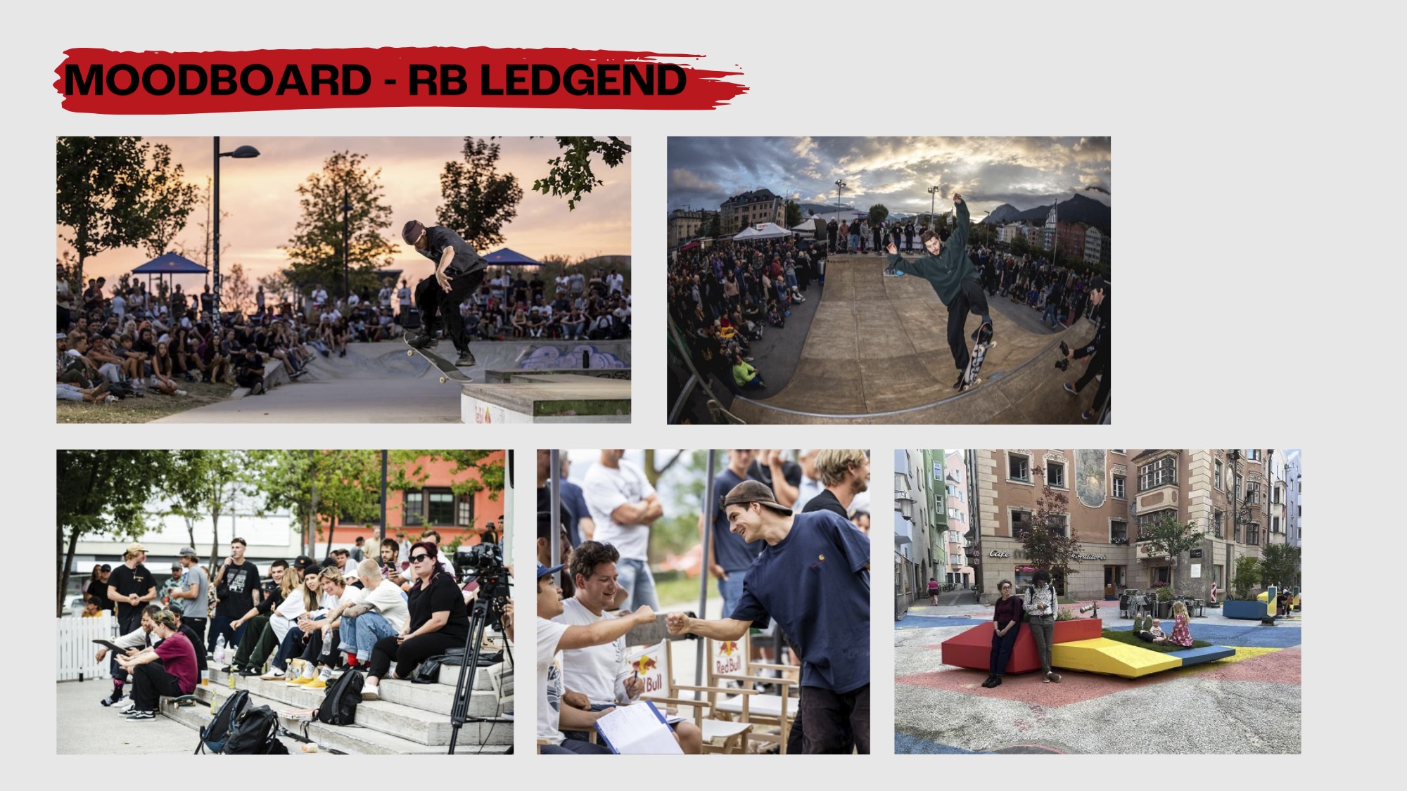 BEFORE · April: EU-wide online qualification via Insta clips. March–May: RB obstacle design. June: Design/Paint week, Photo/Film & Screen-print workshops, local label pop-ups. AFTER · RB obstacle remains in town as a moving feature. June: 4-week skate content window in downtown IBK. Last week of June: exhibition space open.