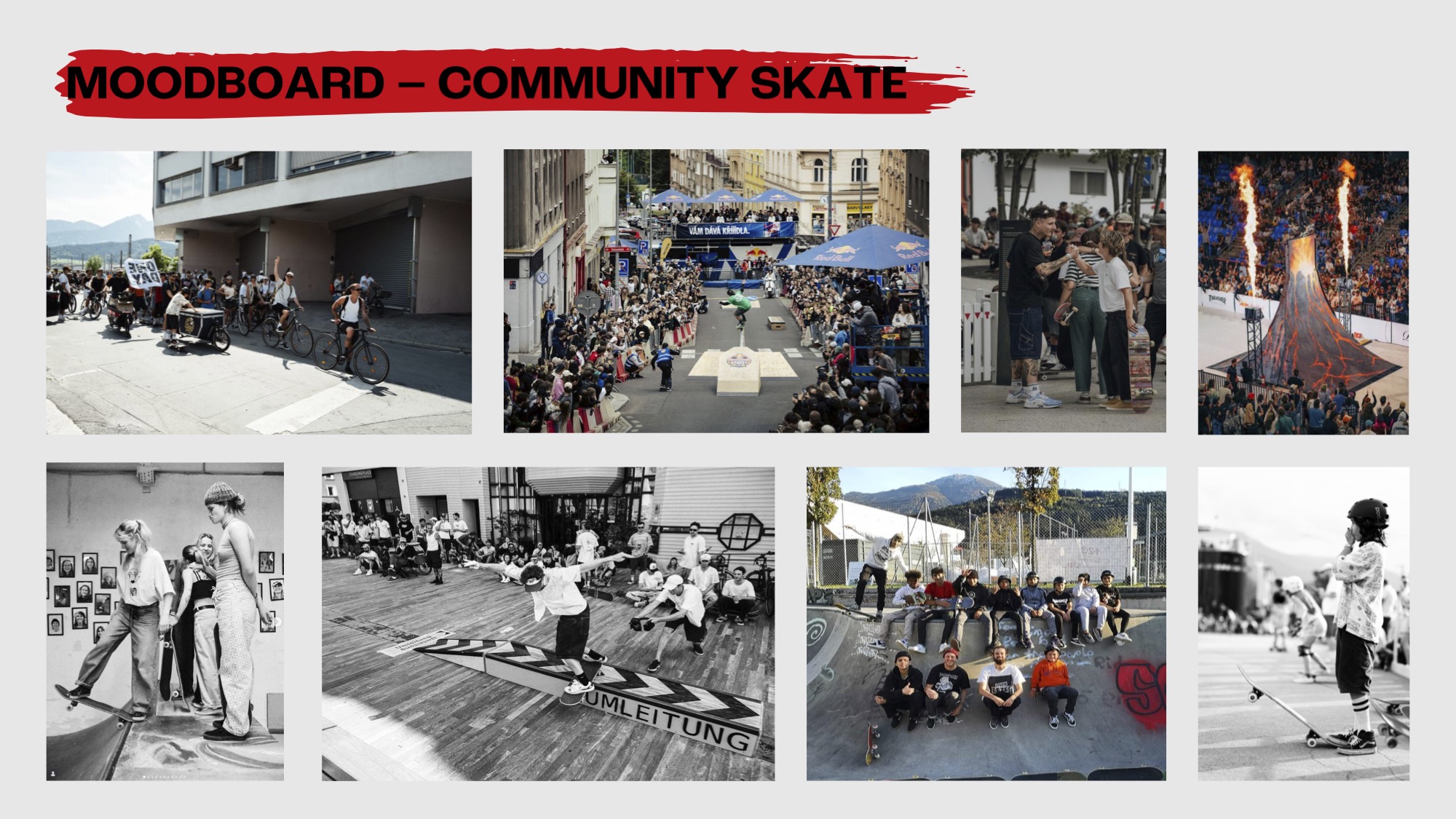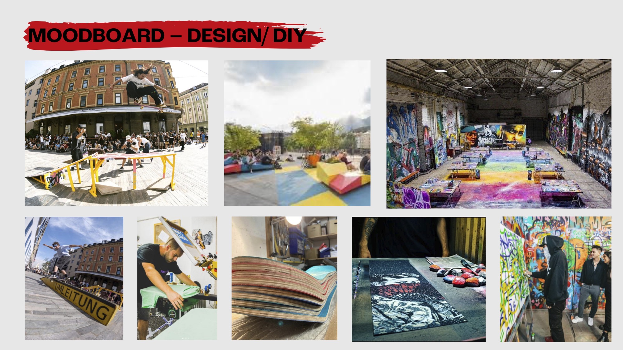 BEFORE · April: EU-wide online qualification via Insta clips. March–May: RB obstacle design. June: Design/Paint week, Photo/Film & Screen-print workshops, local label pop-ups. AFTER · RB obstacle remains in town as a moving feature. June: 4-week skate content window in downtown IBK. Last week of June: exhibition space open.
